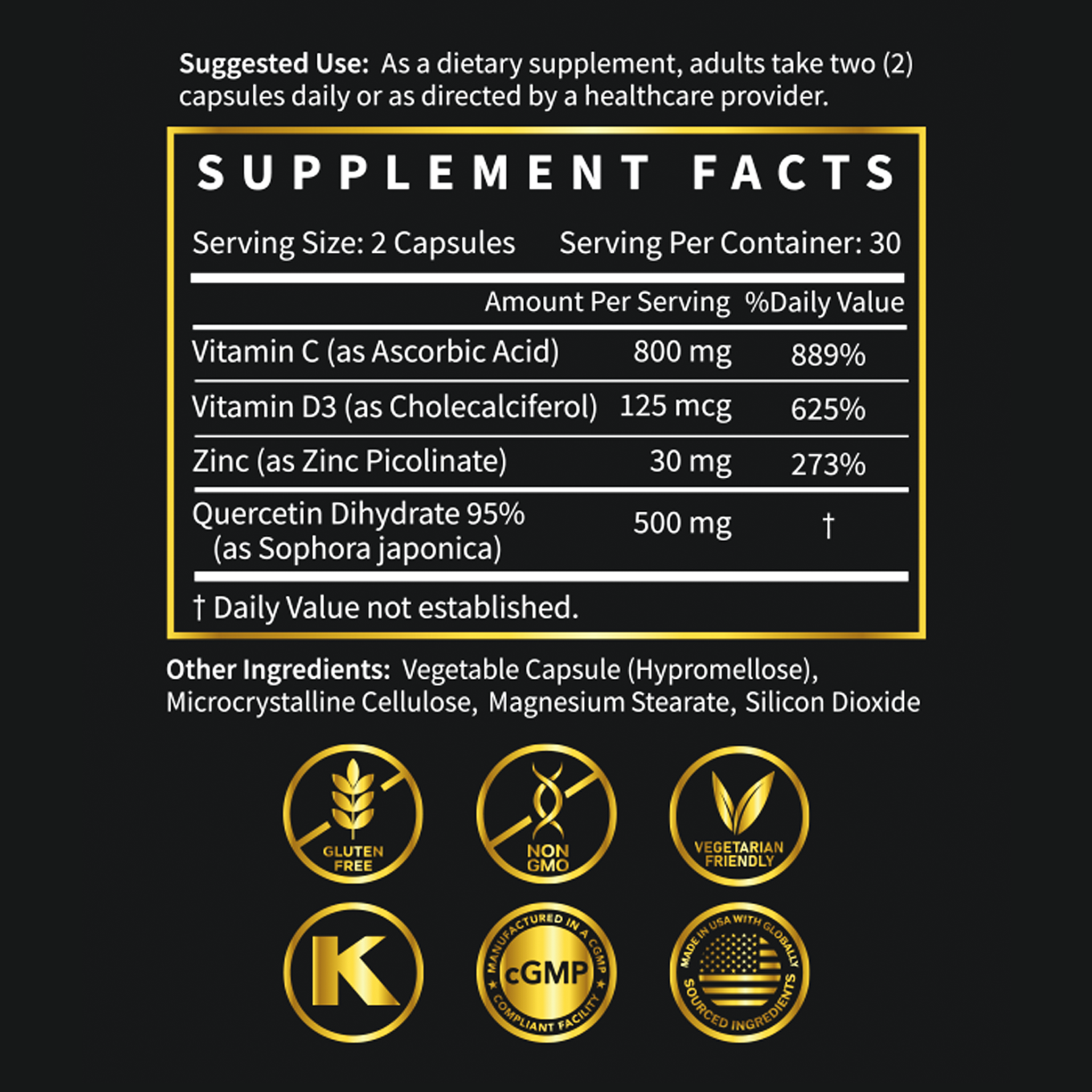 Vitamin C 800 mg, Quercetin 500 mg, Vitamin D3 5,000 IU, Zinc 30 mg